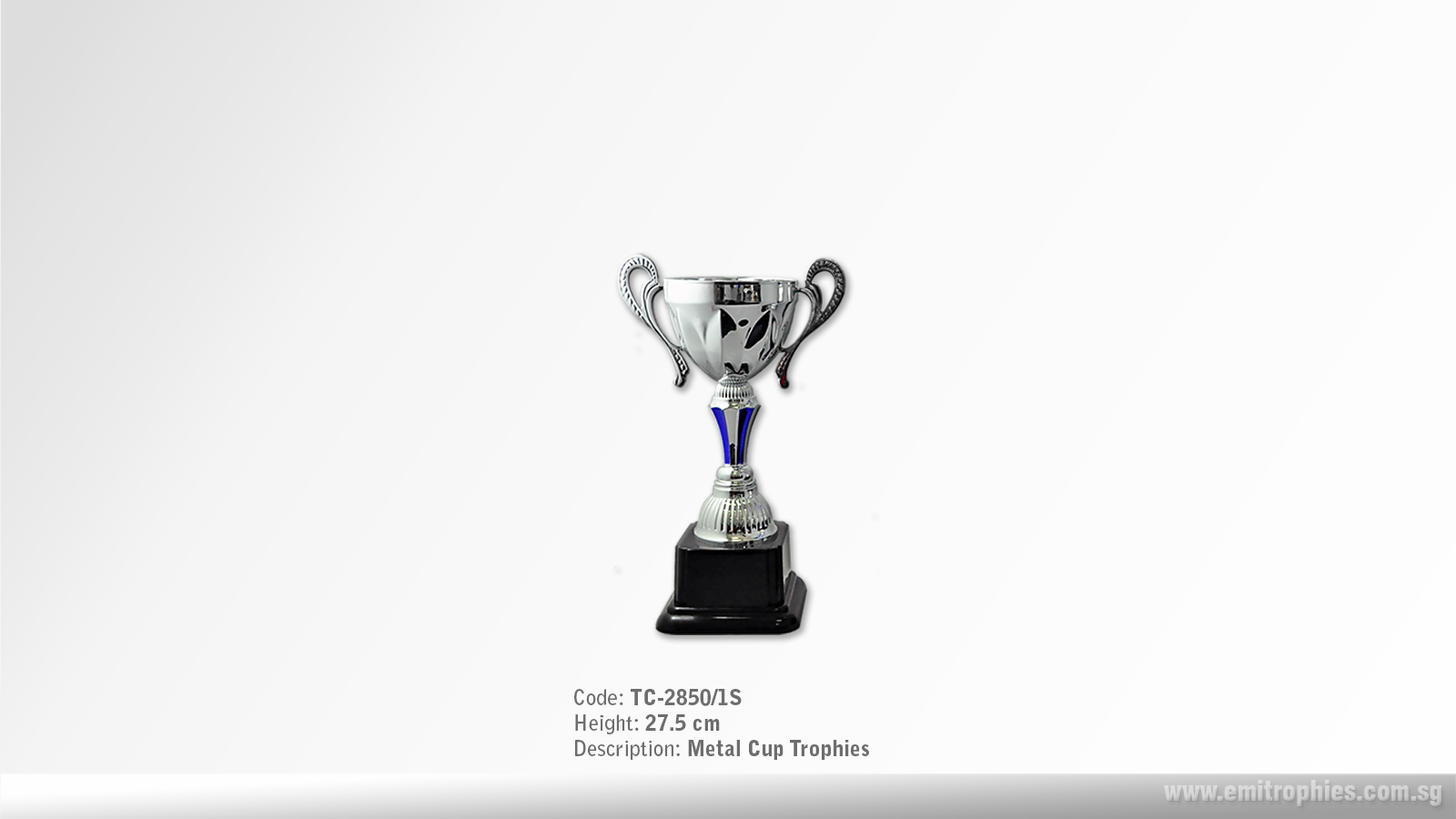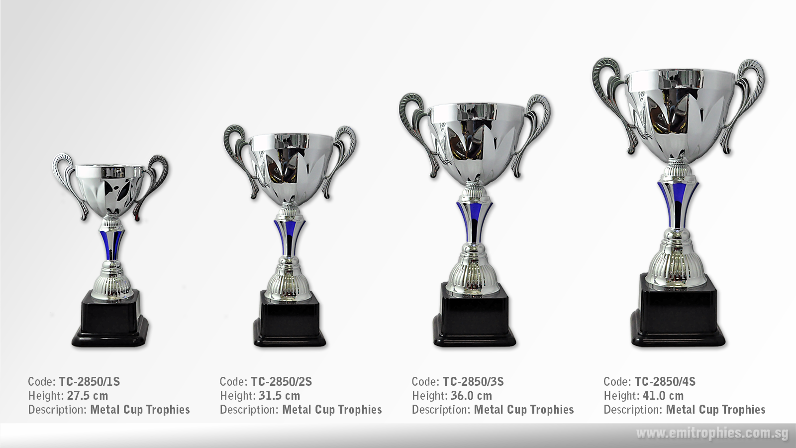 Metal Cup Trophy Available in 4 sizes TC-3035/1S (Height: 28.0 cm) TC-3035/2S (Height: 32.5 cm) TC-3035/3S (Height: 37.0 cm) TC-3035/4S (Height: 42.0 cm) Available in 1 colour: Silver