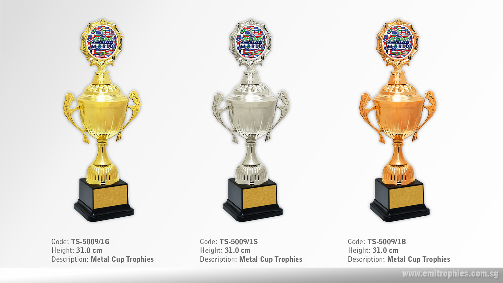 Metal Cup Trophy Available in 3 sizes TC-3037/1G (Height: 37.5 cm) OUT OF STOCK! TC-3037/2G (Height: 43.5 cm) TC-3037/3G (Height: 50.0 cm) OUT OF STOCK! Available in 1 colour: Gold